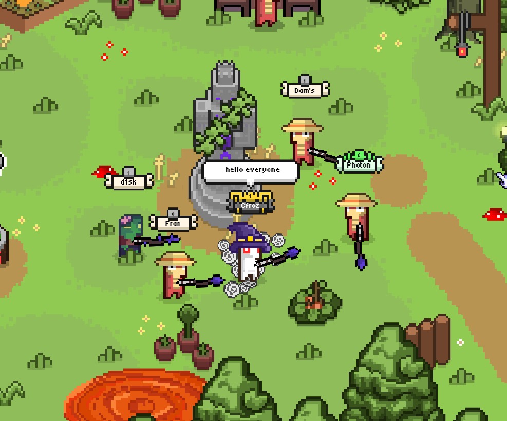 Arcany is a cozy indie MMORPG with bullet-hell style combat and pixel art graphics, featuring horizontal progression across 5 skills, challenges, and allowing players to create their own maps.